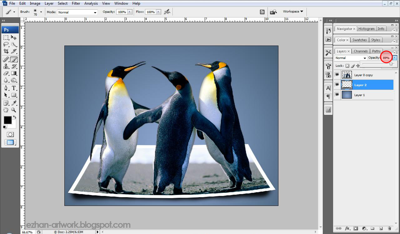 Buat 1 layer baru dibawah gambar penguin tu. Klik pada Brush Tool dan pilih Soft Round Brush. Korang hitamkan pada bawah borber gambar tu . Cara dia mudah je. Korang buat 1 garisan lurus menggunakan Soft round brush tu. Hasilnya akan jadi seperti dibawah.